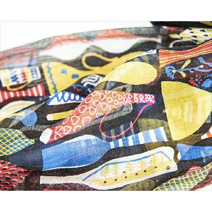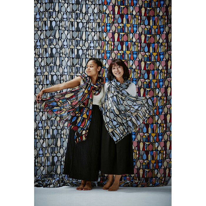 北欧の香り漂う美しいイラストが武藤の絶妙に透ける生地感に載った瞬間に軽やかな動きを手に入れ、 それはよく見かけるプリントストールとは別格の存在感。
