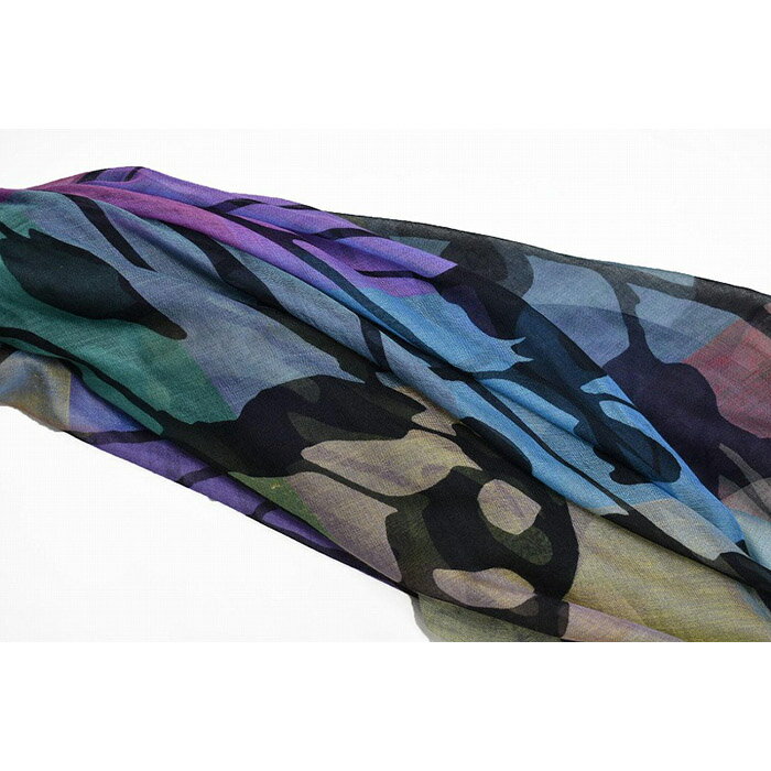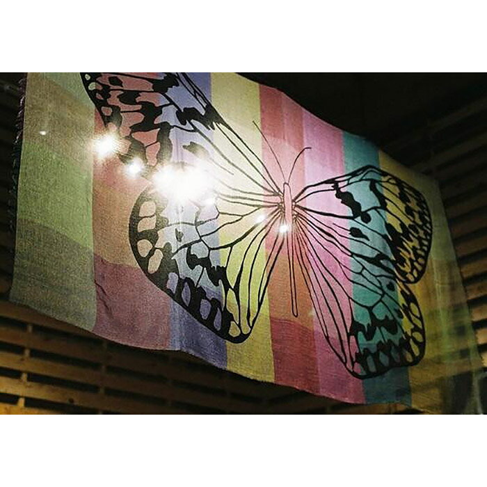 多色に織られた生地の上に大胆な蝶の柄をプリントする事で、巻くだけでなく羽織った時にも 表情を変えてくれるストールです。