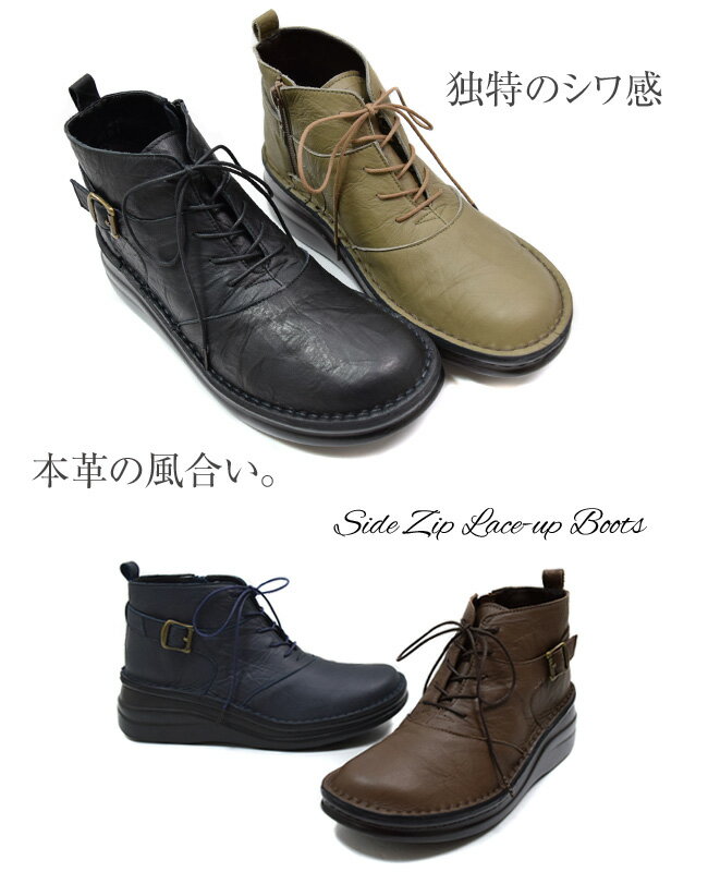 【毎日3名限定50%off★全商品10%offクーポン】In Cholje インコルジェ ブーツ レディース 本革 幅広 3E 日本製 サイドジップ レースアップ ショートブーツ 歩きやすい 疲れにくい 厚底 黒 5cm[FOO-SP-8493]