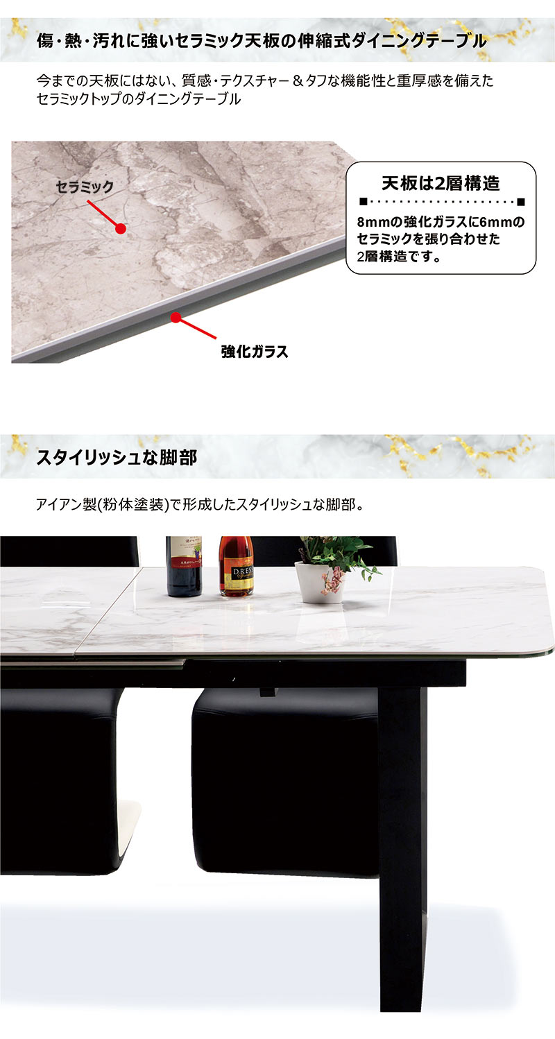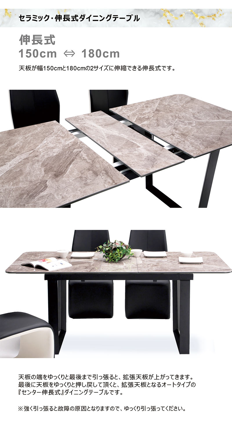 材質 ■天板:セラミック6mm厚・強化ガラス8mm ■脚部:アイアン製(粉体塗装) サイズ ■本体:幅150~180×奥行90×高さ73.5cm 色 ホワイト・グレー色 特徴 お客様組み立て品・輸入品 ※天板の端をゆっくりと最後まで引っ張ると、 拡張天板が上がってきます。
