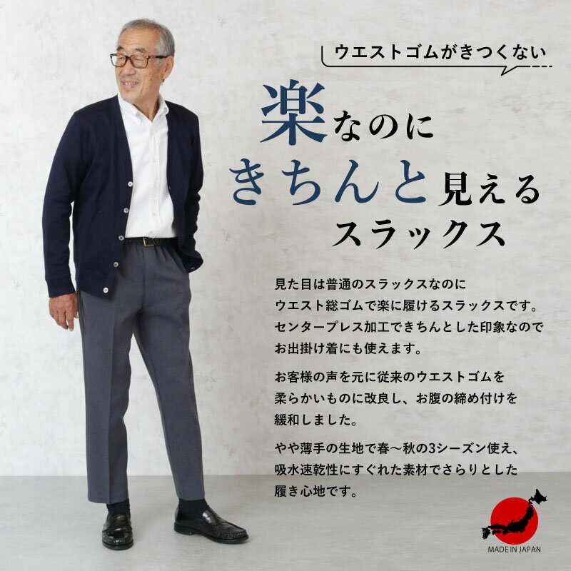 80代 メンズ パンツ スラックス シニアファッション おしゃれ ボトムス 春 夏 春夏 60代 70代 男性 紳士服 紳士 ズボン パンツ「ウエストゴムのきつくない」きちんと見える日本製 総ゴムスラックス 股下65cm ギフト 誕生日 敬老の日 プレゼント ギフト
